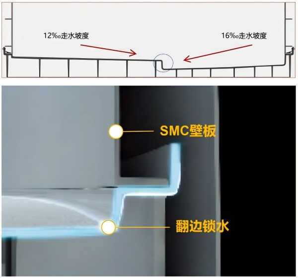 凯玛的解决方式是“把防水做进结构”。SMC防水底盘一体模压成型,与壁板精密嵌合、严丝合缝,配合流水缓坡与翻边锁水设计,有效杜绝渗漏隐患,让防水不再依赖于工人施工水准,而是产品自带的结构属性。